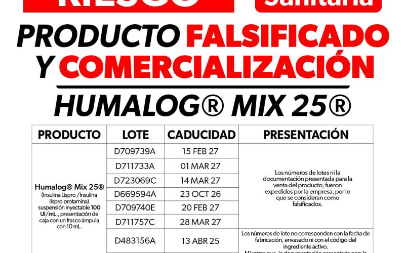 Morelia, Michoacán, 24 de septiembre de 2025.- La Comisión Federal para la Protección contra Riesgos Sanitarios (Cofepris) a través de la Secretaría de Salud de Michoacán (SSM), informa a la población sobre la falsificación y comercialización ilegal del medicamento Humalog®️ Mix 25®️ (Insulina lispro / Insulina lispro protamina), utilizados para el tratamiento de la diabetes. Específicamente, se ha encontrado que la presentación de 100 UI/ml, suspensión inyectable en frasco ámpula de 10 ml, se vende en lotes que no son originales, la empresa Eli Lilly y Compañía de México, S.A. de C.V., ha confirmado que estos lotes no fueron fabricados por ellos. Los lotes identificados como falsificados son: D709739A, D711733A, D723069C, D669594A, D709740E, D711757C, D483156A y D513762C. Estos productos representan un riesgo para la salud de la población, ya que no se garantiza su seguridad, calidad, eficacia ni estabilidad, al desconocerse las condiciones de fabricación, almacenamiento y transporte. Se recomienda a la población abstenerse de adquirir o utilizar los productos Humalog®️ Mix 25®️ de los lotes mencionados, en caso de haberlos usado y presentar algún malestar o reacción adversa, reportarlo al correo electrónico: farmacovigilancia@cofepris.gob.mx o la plataforma VigiRam. Para verificar la autenticidad del producto, puede contactar al titular del registro sanitario o consultar al Buscador Público de Registros Sanitarios de Cofepris en la página https://tramiteselectronicos02.cofepris.gob.mx/BuscadorPublicoRegistrosSanitarios/BusquedaRegistroSanitario.aspx