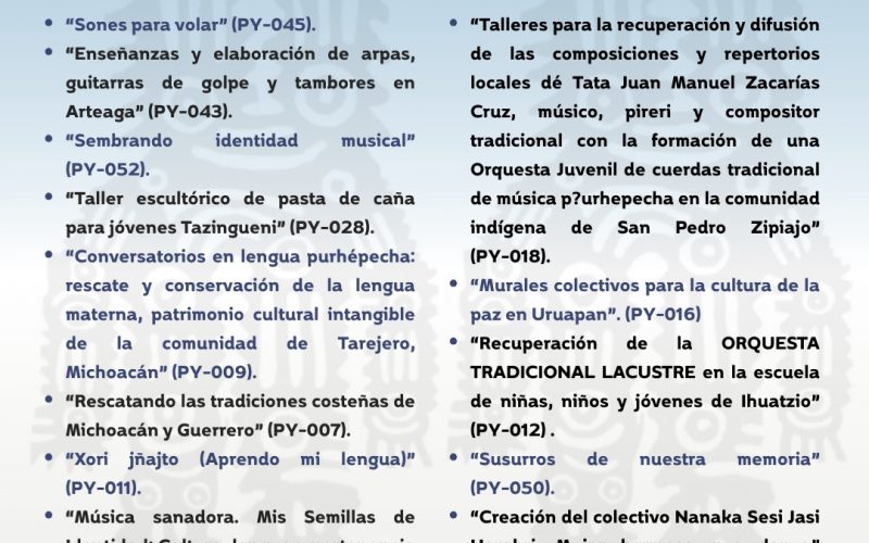 Morelia, Michoacán, 30 de septiembre de 2025.- La Secretaría de Cultura de Michoacán en coordinación con la Secretaría de Cultura federal dieron a conocer los resultados del Programa de Apoyo a las Culturas Municipales y Comunitarias (Pacmyc) 2025, en el que participaron 65 proyectos comunitarios del estado. En esta emisión, 14 propuestas fueron seleccionadas con una bolsa total de 1 millón 312 mil 818 pesos, provenientes de Arteaga, Pátzcuaro, Zacapu, Lázaro Cárdenas, Senguio, Quiroga, Uruapan, Coeneo, Ihuatzio, Cojumatlán y Ziracuaretiro. La convocatoria priorizó proyectos de preservación de la indumentaria tradicional, técnicas artesanales, rituales comunitarios, transmisión de lenguas originarias y afrodescendencia, así como aquellos dirigidos a juventudes en zonas de la estrategia de paz. Entre los proyectos beneficiados destacan “Sones para volar”, “Sembrando identidad musical”, “Conversatorios en lengua purépecha”, “Murales colectivos para la paz en Uruapan”, “Encuentro Nacional de Pueblos Negros” y “Recuperación de la Orquesta Tradicional Lacustre en Ihuatzio”. Con estos apoyos, Pacmyc fortalece el desarrollo cultural comunitario y la salvaguardia del patrimonio inmaterial de las comunidades michoacanas. En este enlace pueden consultar todos los proyectos beneficiados: https://bit.ly/42MtQhG.