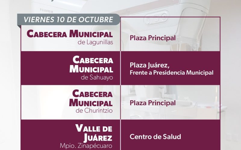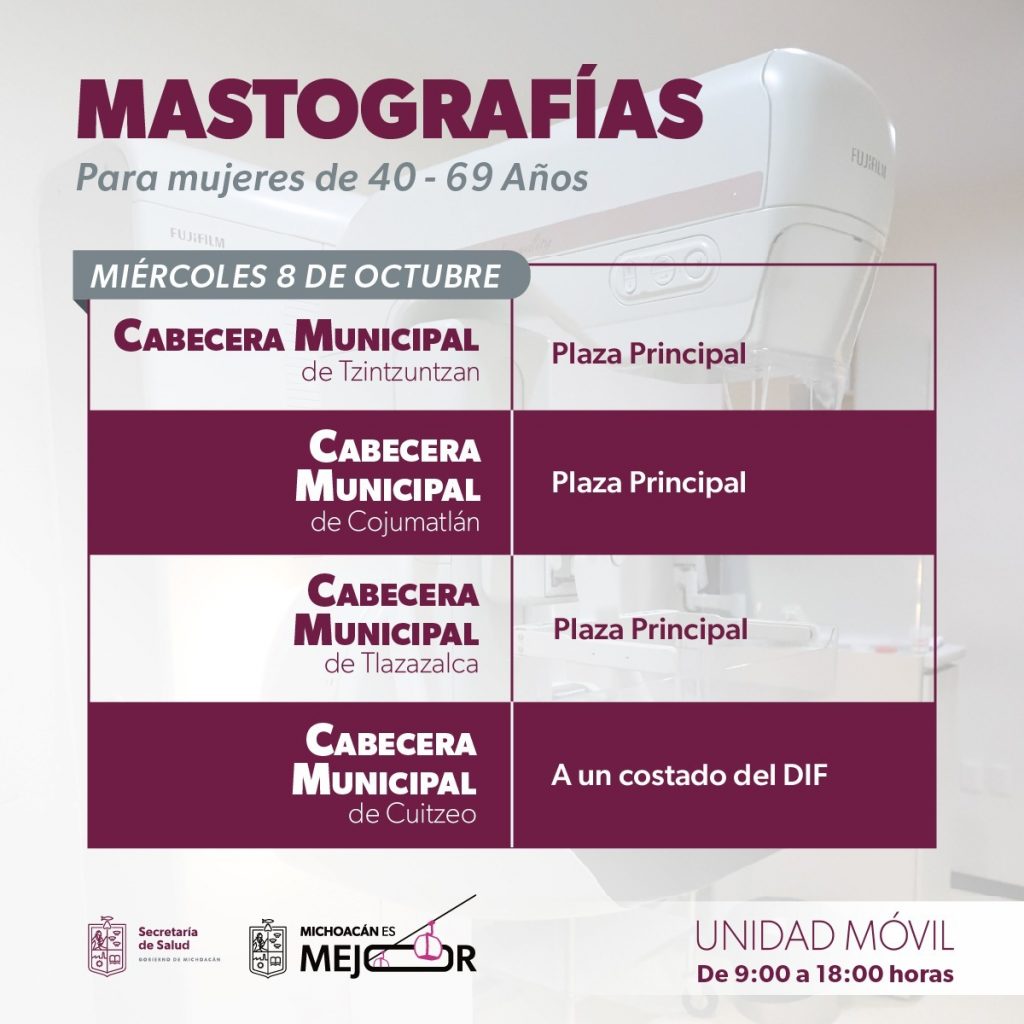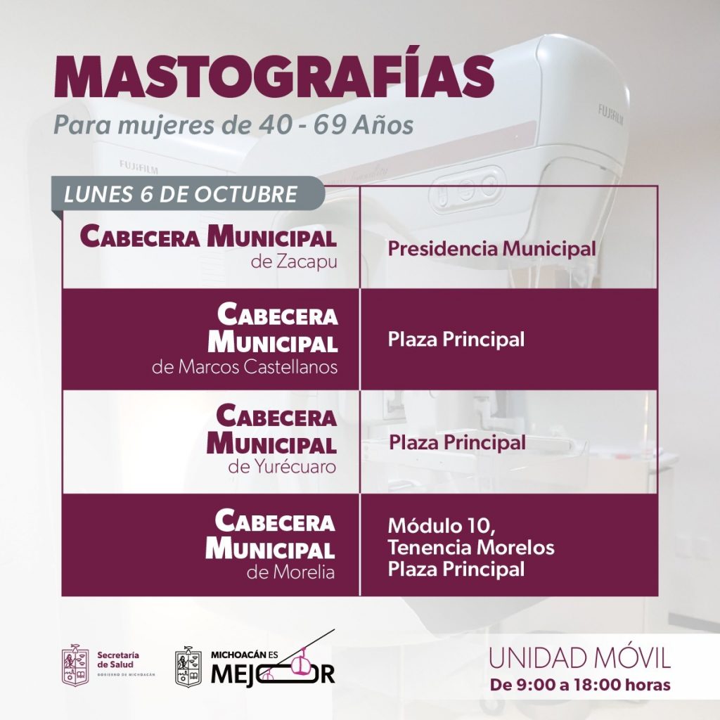 Morelia, Michoacán, 4 de octubre a 2025.- En el marco del Mes de la Lucha contra el Cáncer de Mama, la Secretaría de Salud de Michoacán (SSM) desplegó unidades móviles de mastografía en 14 municipios para realizar pruebas gratuitas que permitan una detección oportuna de posibles casos. Del 6 al 10 de octubre, estas unidades recorrerán Zacapu, Marcos Castellanos, Yurécuaro, Morelia, Quiroga, Cuitzeo, Tzintzuntzan, Cojumatlán, Tlazazalca, Huiramba, Sahuayo, Zinapécuaro, Lagunillas y Churintzio para brindar atención gratuita a mujeres de 40 a 69 años, quienes por cuestiones geográficas se les dificulta el traslado a las centros médicos fijos. Los convoyes de salud están integrados por un equipo de médico, enfermera y radiólogo, todos altamente capacitados para detectar cambios o anormalidades en los tejidos del seno mediante la mastografía. El estudio consiste en tomar dos radiografías de cada mamá y tiene una duración aproximada de 15 minutos, requiere la compresión del pecho, lo que puede causar molestias tolerables. No todos los resultados anormales significan cáncer, de cada 10 mujeres con mastografía anormal, solo una presenta esta enfermedad. Las mujeres interesadas serán atendidas de 9:00 a 18:00 horas y deberán presentarse con copia del INE, aseadas, rasuradas, sin uso de desodorantes, talcos, perfumes, cremas, ni alhajas, y que haya pasado el periodo de un año desde su última mastografía. Para conocer la ubicación donde serán instaladas las unidades, pueden visitar la página oficial de Facebook de la SSM en el siguiente enlace: https://www.facebook.com/share/p/1CcYwPpAvF/.