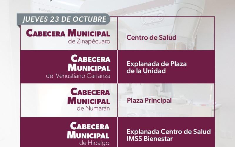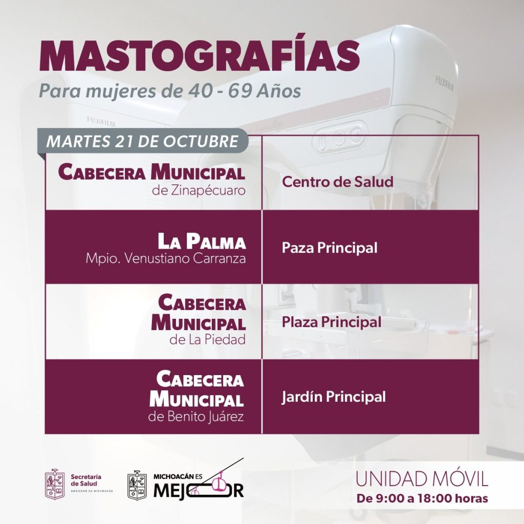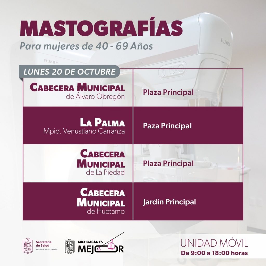 Morelia, Michoacán, 20 de octubre de 2025.- La Secretaría de Salud de Michoacán (SSM) continúa con el despliegue de unidades móviles de mastografía para la detección oportuna del cáncer de mama en mujeres de 40 a 69 años de edad, del 20 al 24 de octubre estarán en 11 municipios de la entidad. Álvaro Obregón, Venustiano Carranza, La Piedad, Huetamo, Zinapécuaro, Benito Juárez, Numarán, Hidalgo, Morelia, Penjamillo y Tlalpujahua son los municipios en los que las mujeres podrán realizarse el estudio de manera gratuita, solo tendrán que presentarse con una copia de su identificación oficial, aseadas, rasuradas y sin uso de perfumes, cremas y talcos o joyas, la atención será otorgada en un horario de 9:00 a 18:00 horas. Para conocer el día y lugar exacto donde se encontrarán las unidades móviles, pueden consultar la cuenta oficial de la SSM en Facebook https://www.facebook.com/share/p/19wvphYkXj/?mibextid=wwXIfr Además de las unidades móviles, la SSM también cuenta con mastógrafos fijos que brindan atención gratuita durante todo el año, en los hospitales generales “Dr. Miguel Silva” de Morelia, Zamora, Uruapan y La Piedad, con servicio de lunes a viernes, en un horario de 08:00 a 15:30 horas, así como en la Unidad de Especialidades Médicas dedicada al Cáncer de Mama, ubicada en Morelia, en un horario de 07:00 a 18:30 horas. La institución reitera que, si bien el cáncer de mama no se puede prevenir, si se pueden modificar hábitos para reducir el riesgo de desarrollar la enfermedad, por ello, recomienda llevar un estilo de vida saludable con dieta equilibrada rica en frutas, verduras y hortalizas, evitar consumo de azúcares, tabaco y alcohol, mantener peso saludable, realizar ejercicio al menos 30 minutos diarios y realizarse su estudio de mama a partir de los 40 años, para la detección temprana.