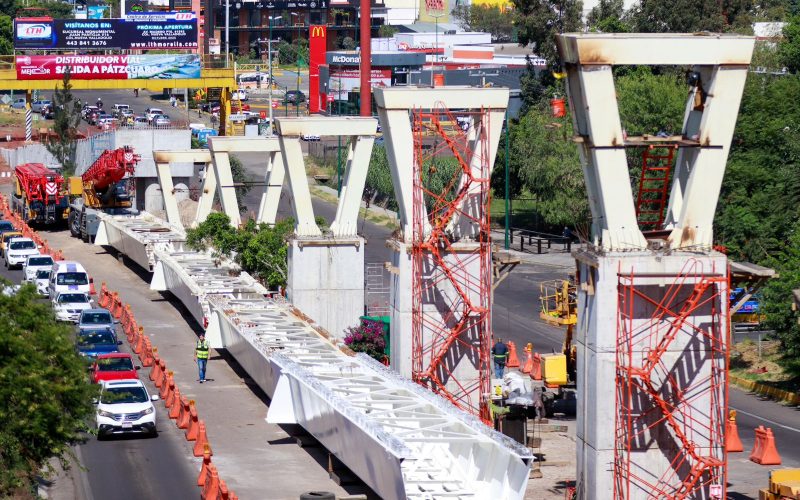 Morelia, Michoacán, 24 de octubre de 2025.- El distribuidor vial salida a Pátzcuaro en Morelia continúa con un avance significativo, alcanzando ya el 54 por ciento, puntualizó el secretario de Comunicaciones y Obras Públicas, Rogelio Zarazúa Sánchez. El funcionario indicó que, en breve, se iniciará la colocación de las trabes metálicas que darán forma al paso elevado. El titular de la Secretaría de Comunicaciones y Obras Públicas detalló que esta zona, donde diariamente circulan cerca de 79 mil vehículos, es un punto con alto aforo vehicular. El distribuidor contará con dos estructuras superiores que permitirán el libre tránsito hacia salida a Pátzcuaro o calzada La Huerta, suprimiendo semáforos y retornos peligrosos que han provocado innumerables accidentes. Zarazúa Sánchez detalló que la obra actualmente está en proceso de colocación de estructuras y relleno para rampas, habilitado, armado y soldadura en vigas, colado de columnas restantes, así como armado de acero de refuerzo en columnas. Puntualizó que esta obra beneficiará directamente a más de 197 mil habitantes de la zona sur de la capital michoacana y favorecerá a las rutas del servicio público y transporte, en las cuales a diario viajan miles de personas trabajadoras y estudiantes.