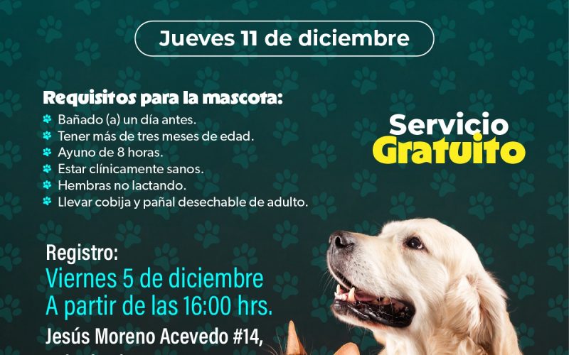 Morelia, Michoacán, 7 de diciembre de 2025.- Con el objetivo de fomentar la salud y la tenencia responsable de perros y gatos, la Secretaría de Salud de Michoacán (SSM) llevará cabo una jornada gratuita de esterilización en Morelia, el próximo jueves 11 de diciembre. Es necesario que las y los interesados registren a sus animales con anticipación, el día viernes 5 de diciembre a partir de las 16:00 horas, en la calle Jesús Moreno Acevedo 14, colonia El Durazno. Para que puedan ser intervenidos de forma segura, deberán ser presentados con ayuno de 12 horas, estar aseados un día antes, ser mayores de tres meses de edad y en caso de las hembras, no deben estar lactando. La esterilización es el método más eficaz para prevenir la sobrepoblación de perros y gatos, lo que a su vez reduce el número de animales en situación de calle, disminuyendo la población de animales abandonados que sufren hambre, enfermedad y maltrato en las calles.