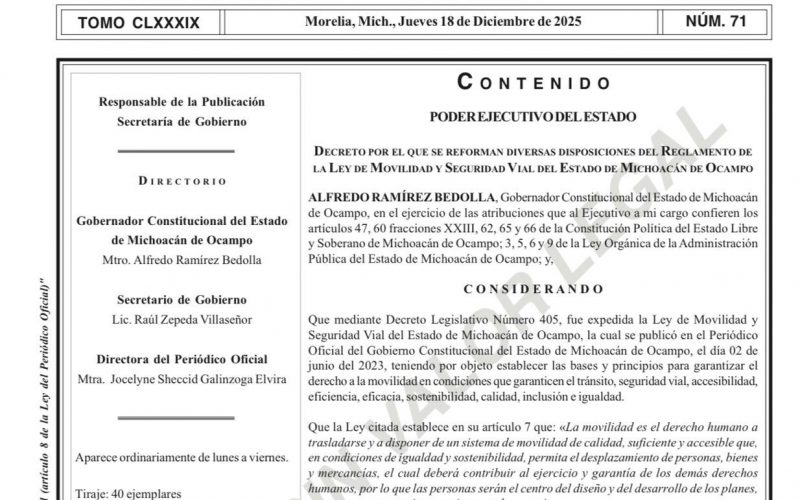 Morelia, Michoacán, 19 de diciembre de 2025.- El secretario de Gobierno informó la publicación en el Periódico Oficial del Estado del decreto que reforma el Reglamento de la Ley de Movilidad y Seguridad Vial y elimina las multas e infracciones económicas de tránsito en Michoacán. Esta medida pone fin a cualquier intento de abuso de autoridad y se cierra la puerta a posibles actos de corrupción por parte de cuerpos policiales, dijo el encargado de la política interna. El secretario destacó que la reforma establece de manera clara la eliminación de la multa como sanción pecuniaria dentro del régimen de tránsito y seguridad vial, sustituyéndola por mecanismos correctivos como amonestaciones, arrestos administrativos de hasta 36 horas, suspensión o cancelación de licencias, puntos de penalización en la licencia, así como remisión de vehículos al depósito en casos específicos, privilegiando así un modelo preventivo, educativo y de corresponsabilidad social. Informó que el decreto retoma el principio de movilidad como derecho humano y se adhiere a un enfoque que fortalece el tránsito libre, seguro y sin discrecionalidad, bajo lineamientos que buscan fortalecer la confianza ciudadana, erradicar la visión recaudatoria de las sanciones y garantizar que las medidas establecidas realmente contribuyan a la seguridad vial, a la reducción de riesgos y al respeto de los derechos de las personas usuarias de la vía pública. Con esta publicación oficial, el Gobierno del Estado no renuncia a su obligación de proteger la seguridad vial, sino que reorienta el modelo hacia uno más justo y eficaz, donde la autoridad actúe con legalidad, proporcionalidad y legitimidad, asegurando condiciones para un libre tránsito y una movilidad con reglas claras, sin espacio para abusos ni corrupción.